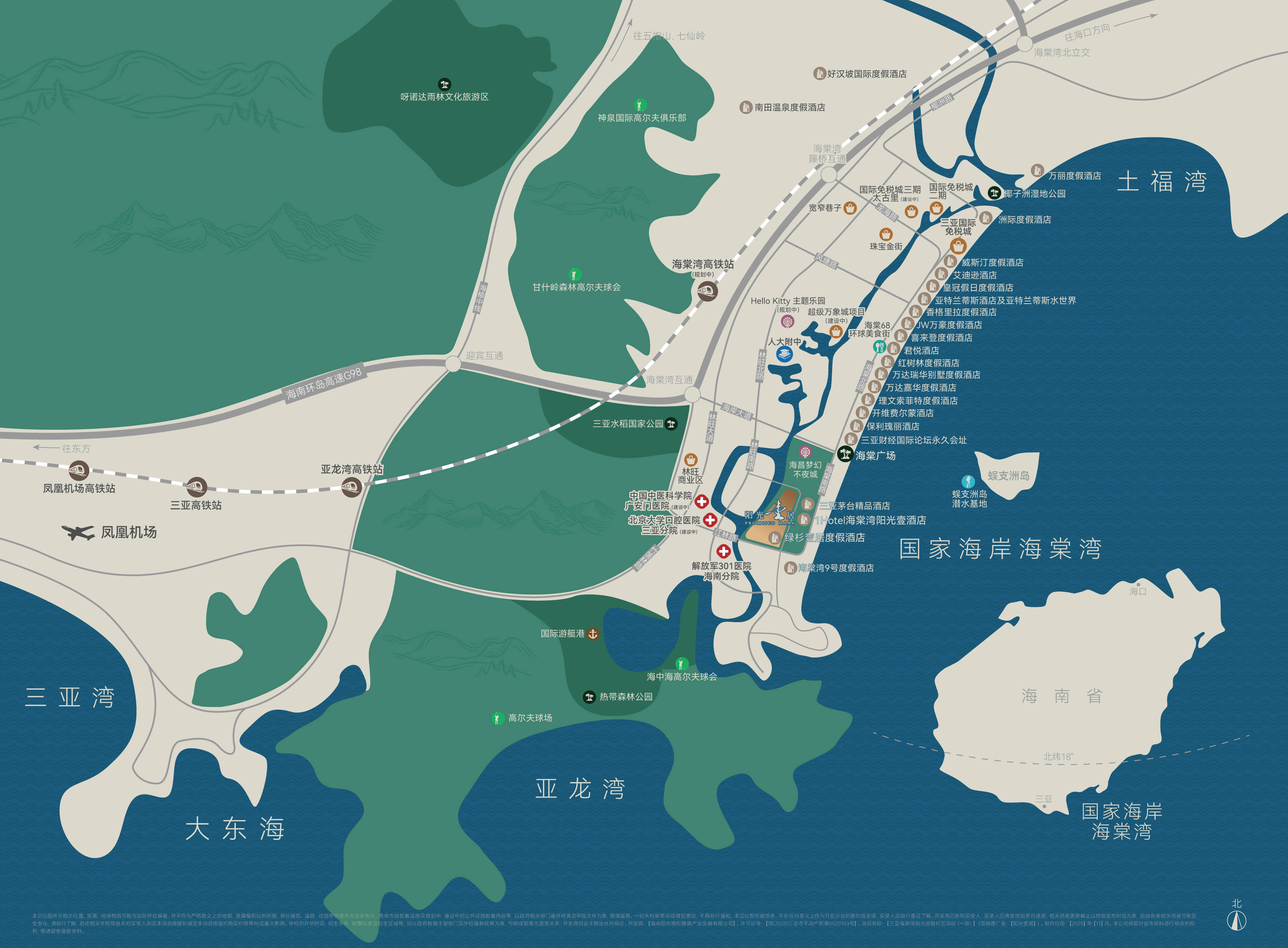 三亚国际免税购物中心、云戒岛沉浸式商业街、中免太古合作项目(建设中) 解放军总医院海南医院(301医院)、赫尔曼运动康复医院、伊美尔国际美容医院、亚洲心脏协会三亚应泽医院