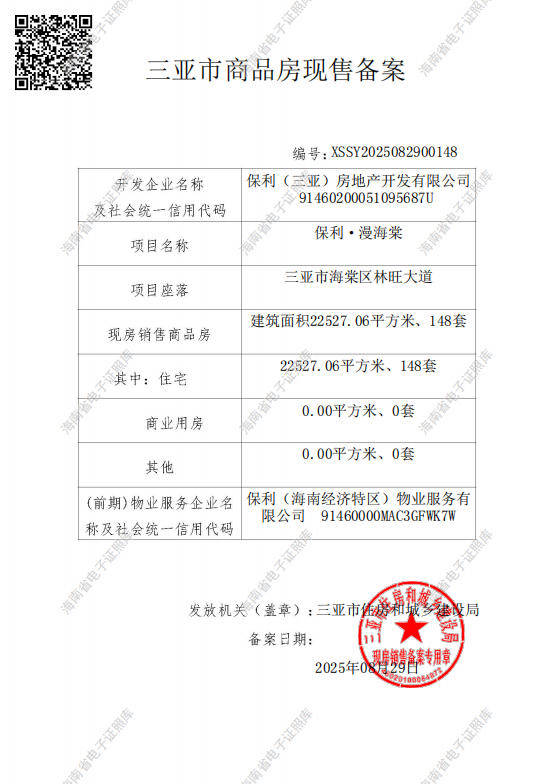 XSSY2025082900148 查看图片 | 2025-08-29 | 建筑面积22527.06平方米、148套,其中(住宅):22527.06平方米、148套 ,商业用房:0.00平方米、0套, 其他:0.00平方米、0套。