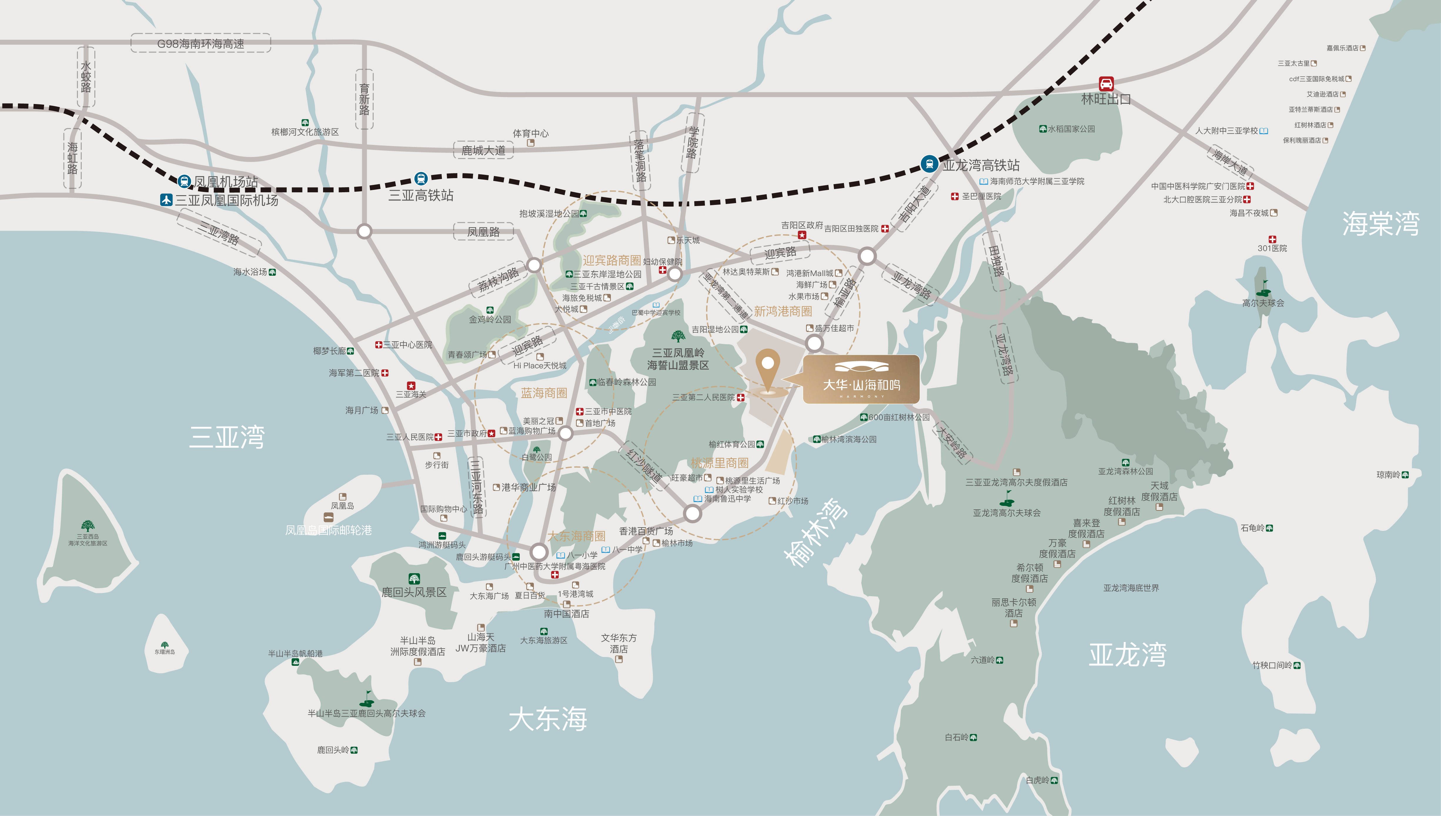 「国际度假」近享三亚大东海疗养基地、文华东方酒店、君澜度假酒店、万豪JW酒店、洲际酒店等度假配套簇拥。