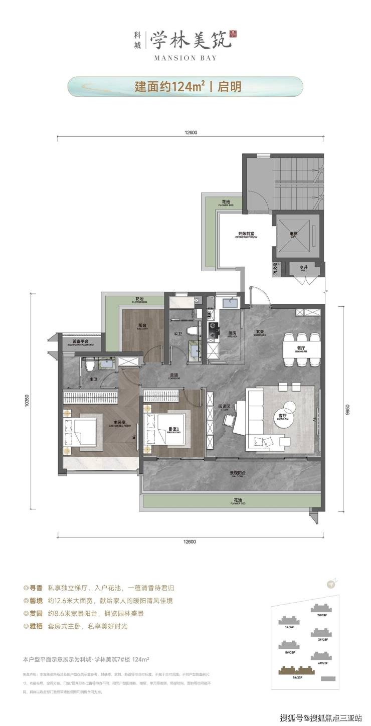 建面约124-179㎡的3-4房,户户标配大面宽空间、入户花园、宽景阳台及满配精装交付规格,户户尊享电梯入户,筑就崖州湾塔尖生活主场;头排产品建面约179㎡四房户型更可奢享逾18米奢致面宽、270°环幕观景阳台与双套房高定配置,独揽万千尊崇。