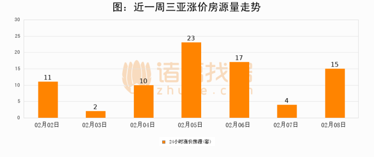 根据诸葛找房数据显示,三亚24小时涨价房源量为15套,较02月07日增加11套,环比上涨275%。与此同时,涨价房源占比小幅扩大,业主信心有所提升。