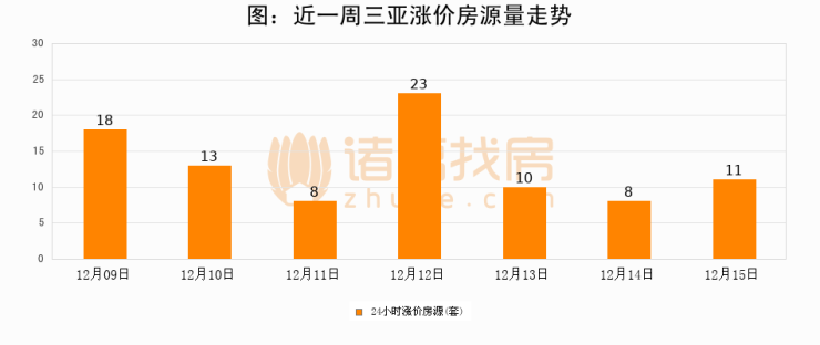 根据诸葛找房数据显示,三亚24小时涨价房源量为11套,较12月14日增加3套,环比上涨37.5%。与此同时,涨价房源占比小幅扩大,业主信心有所提升。