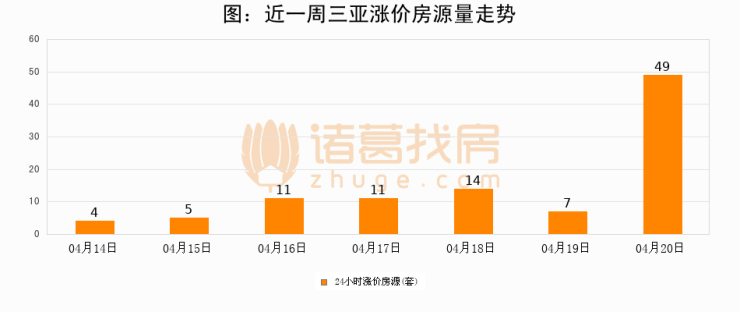 根据诸葛找房数据显示,三亚24小时涨价房源量为49套,较04月19日增加42套,环比上涨600%。与此同时,涨价房源占比小幅扩大,业主信心有所提升。
