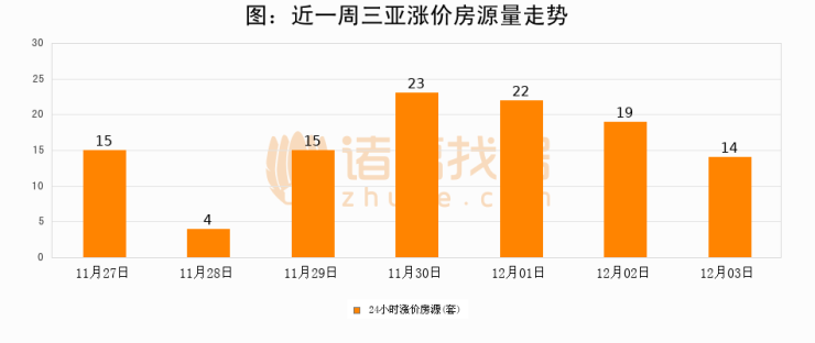 根据诸葛找房数据显示,三亚24小时涨价房源量为14套,较12月02日减少5套,环比下降26.3%。与此同时,涨价房源占比小幅回落,对于购房者来说是一个入市窗口期,购房者可抓住时机入市。
