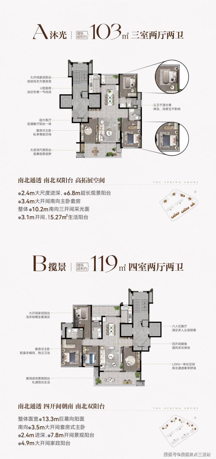 项目规划建筑面积约103-238㎡改善户型,层高最高约3.05m,南北通透、双景观阳台、南向多面宽,于一方宽境里,满足对阔绰空间与舒适格局的拥享。
