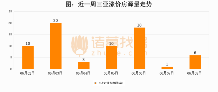 根据诸葛找房数据显示,三亚24小时涨价房源量为6套,较06月07日增加5套,环比上涨500%。与此同时,涨价房源占比小幅扩大,业主信心有所提升。