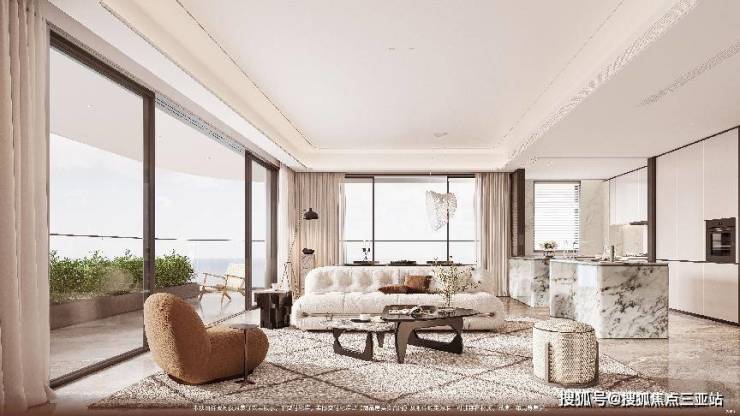 这是近十年三亚难得一见的一线的海景大平层,将首排的视线、尺度与私密性沉入日常起居的每一个细部。大面宽的布局让阳光以最舒展的角度进入起居,转角环幕与高窗地比把海平线从“可看”推进到“可用”;270°环抱式阳台将观海的动线与交流的动线叠合,让生活的舞台与风景同频。