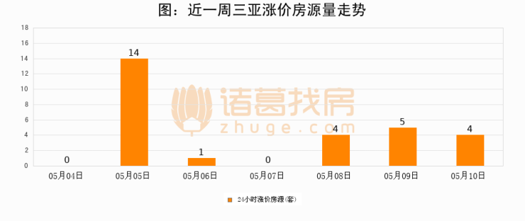 根据诸葛找房数据显示,三亚24小时涨价房源量为4套,较05月09日减少1套,环比下降20%。与此同时,涨价房源占比小幅回落,对于购房者来说是一个入市窗口期,购房者可抓住时机入市。