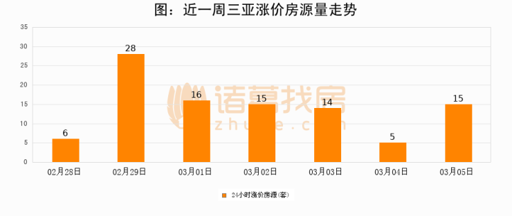 根据诸葛找房数据显示,三亚24小时涨价房源量为15套,较03月04日增加10套,环比上涨200%。与此同时,涨价房源占比小幅扩大,业主信心有所提升。