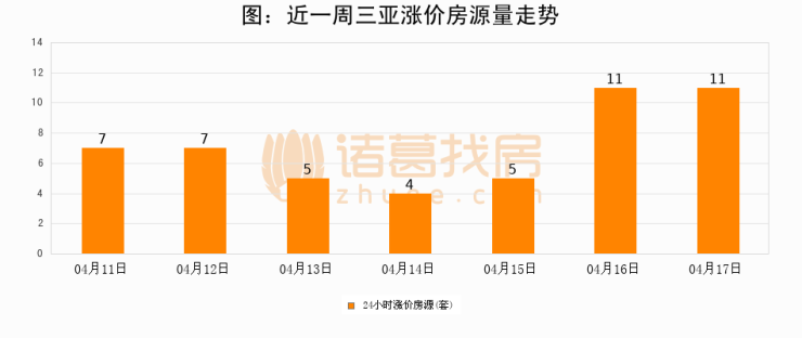 根据诸葛找房数据显示,三亚24小时涨价房源量为11套,较04月16日持平。
