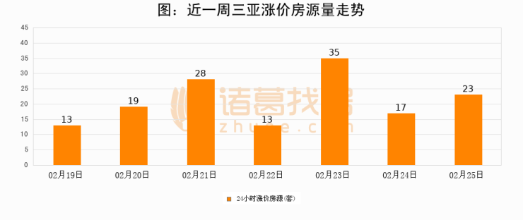 根据诸葛找房数据显示,三亚24小时涨价房源量为23套,较02月24日增加6套,环比上涨35.3%。与此同时,涨价房源占比小幅扩大,业主信心有所提升。