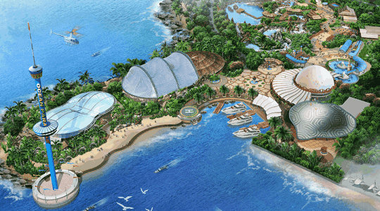 海洋欢乐世界:总规划占地5000亩,是香港迪士尼公园的约3倍,排水量是香港海洋公园的约6倍多,总投400亿元。
