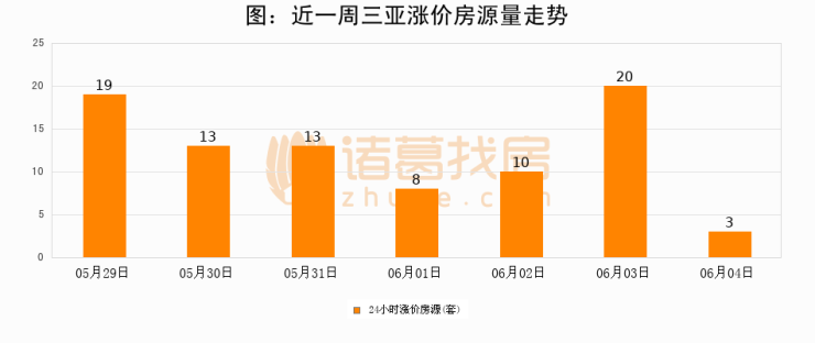 根据诸葛找房数据显示,三亚24小时涨价房源量为3套,较06月03日减少17套,环比下降85%。与此同时,涨价房源占比小幅回落,对于购房者来说是一个入市窗口期,购房者可抓住时机入市。