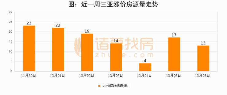 根据诸葛找房数据显示,三亚24小时涨价房源量为13套,较12月05日减少4套,环比下降23.5%。与此同时,涨价房源占比小幅回落,对于购房者来说是一个入市窗口期,购房者可抓住时机入市。