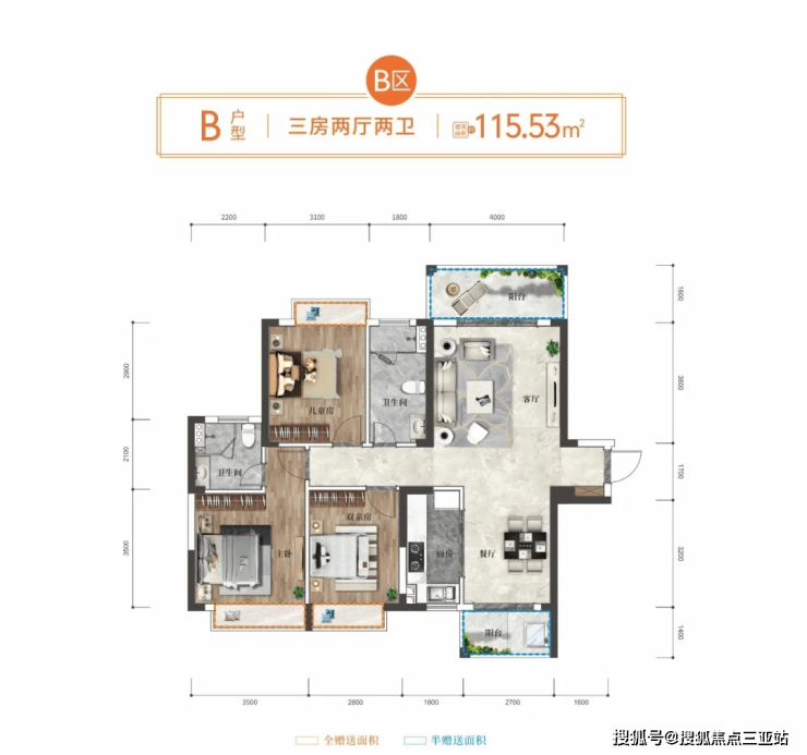 B户型:115平阳光3房,入户大玄关充沛收纳空间,双品质卫浴让生活更从容
