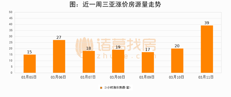 根据诸葛找房数据显示,三亚24小时涨价房源量为39套,较03月10日增加19套,环比上涨95%。与此同时,涨价房源占比小幅扩大,业主信心有所提升。