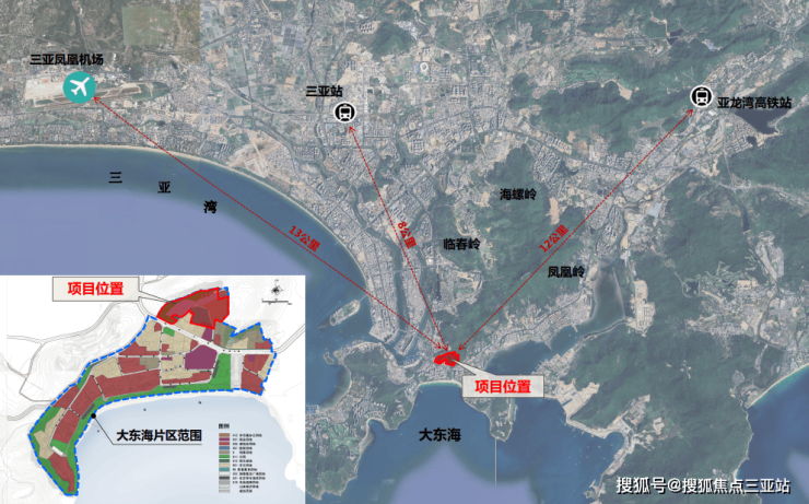 项目用地位于三亚市大东海片区西北侧,北侧靠近自然山体,南侧远眺大东海,主要依靠榆亚路与外围交通衔接,距三亚站约8公里,距三亚凤凰机场及高铁站约13公里。