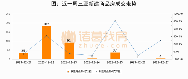 根据三亚市房产信息中心数据显示,2023年12月27日三亚新建商品房成交4套,较昨日增加3套,环比上涨300%