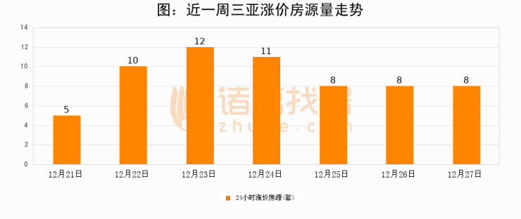 根据诸葛找房数据显示,三亚24小时涨价房源量为8套,较12月26日持平。