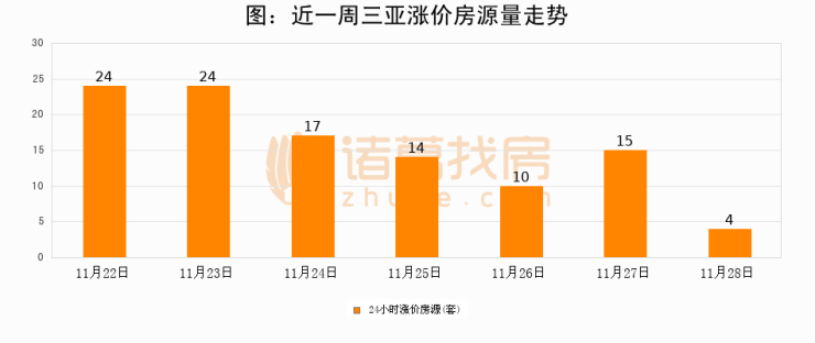 根据诸葛找房数据显示,三亚24小时涨价房源量为4套,较11月27日减少11套,环比下降73.3%。与此同时,涨价房源占比小幅回落,对于购房者来说是一个入市窗口期,购房者可抓住时机入市。