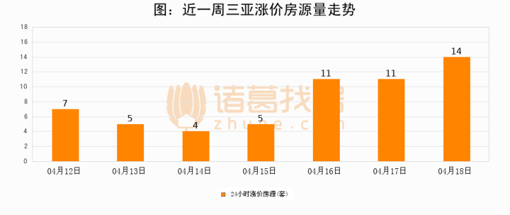 根据诸葛找房数据显示,三亚24小时涨价房源量为14套,较04月17日增加3套,环比上涨27.3%。与此同时,涨价房源占比小幅扩大,业主信心有所提升。