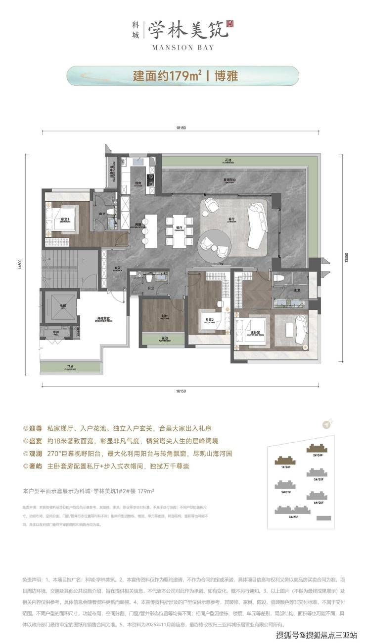 项目共打造324户平层臻席,户户尊享电梯入户,户户标配入户花园、大面宽空间、宽景阳台及满配精装交付规格;头排产品建面约179m四房户型更可奢享约18米奢致面宽、270°环幕观景阳台、双套房等奢华配置,筑就崖州湾尊崇生活典范。