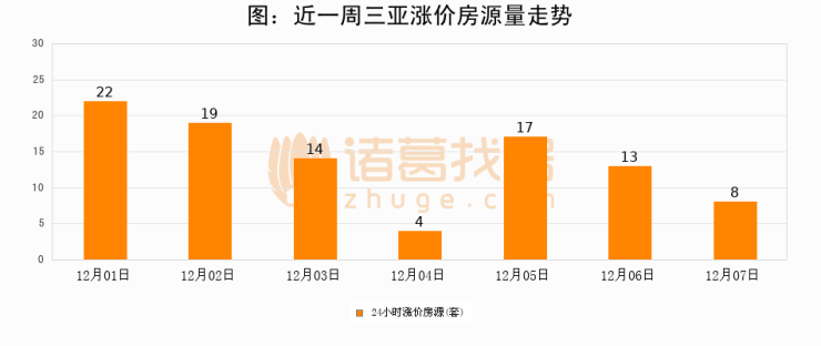 根据诸葛找房数据显示,三亚24小时涨价房源量为8套,较12月06日减少5套,环比下降38.5%。与此同时,涨价房源占比小幅回落,对于购房者来说是一个入市窗口期,购房者可抓住时机入市。
