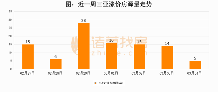 根据诸葛找房数据显示,三亚24小时涨价房源量为5套,较03月03日减少9套,环比下降64.3%。与此同时,涨价房源占比小幅回落,对于购房者来说是一个入市窗口期,购房者可抓住时机入市。