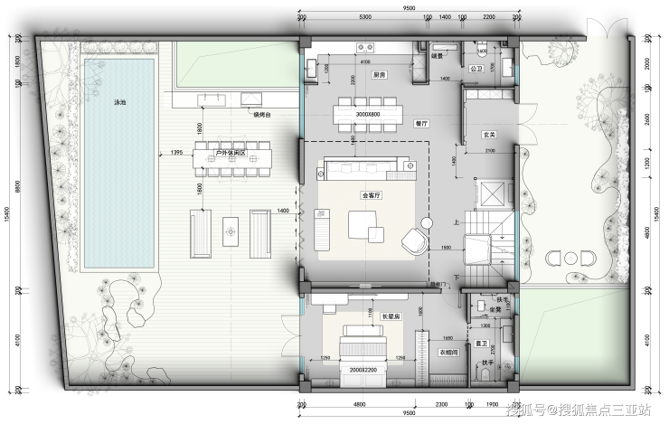 B户型(L字型)建筑面积:约173㎡,5房4厅7卫+2保姆房+2车位+1庭院泳池,使用面积920m²-1410m²