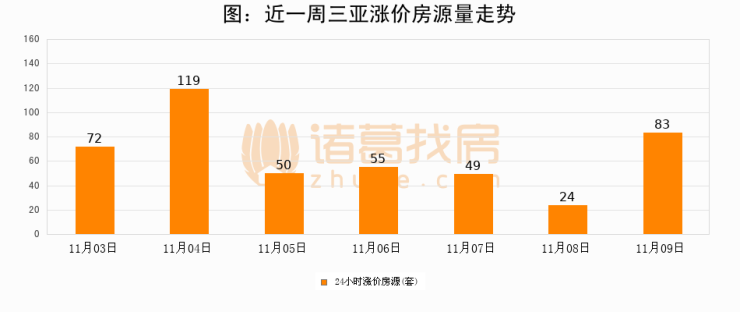 根据诸葛找房数据显示,三亚24小时涨价房源量为83套,较11月08日增加59套,环比上涨245.8%。与此同时,涨价房源占比小幅扩大,业主信心有所提升。