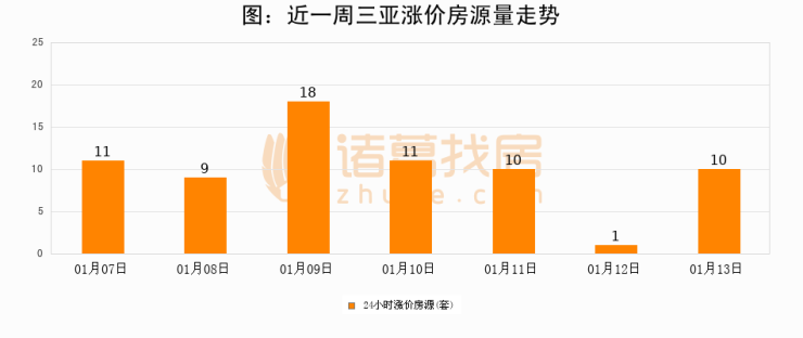 根据诸葛找房数据显示,三亚24小时涨价房源量为10套,较01月12日增加9套,环比上涨900%。与此同时,涨价房源占比小幅扩大,业主信心有所提升。