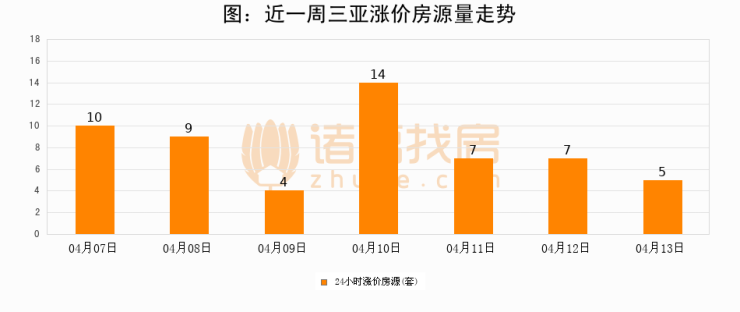 根据诸葛找房数据显示,三亚24小时涨价房源量为5套,较04月12日减少2套,环比下降28.6%。与此同时,涨价房源占比小幅回落,对于购房者来说是一个入市窗口期,购房者可抓住时机入市。