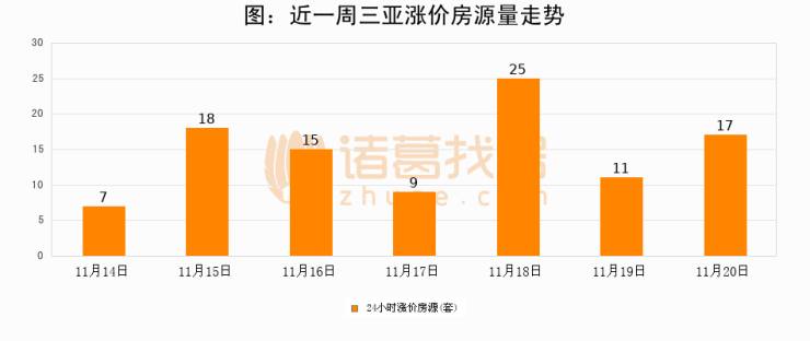 根据诸葛找房数据显示,三亚24小时涨价房源量为17套,较11月19日增加6套,环比上涨54.5%。与此同时,涨价房源占比小幅扩大,业主信心有所提升。