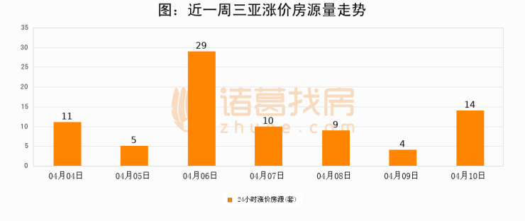 根据诸葛找房数据显示,三亚24小时涨价房源量为14套,较04月09日增加10套,环比上涨250%。与此同时,涨价房源占比小幅扩大,业主信心有所提升。