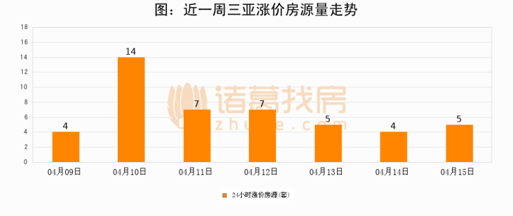 根据诸葛找房数据显示,三亚24小时涨价房源量为5套,较04月14日增加1套,环比上涨25%。与此同时,涨价房源占比小幅扩大,业主信心有所提升。