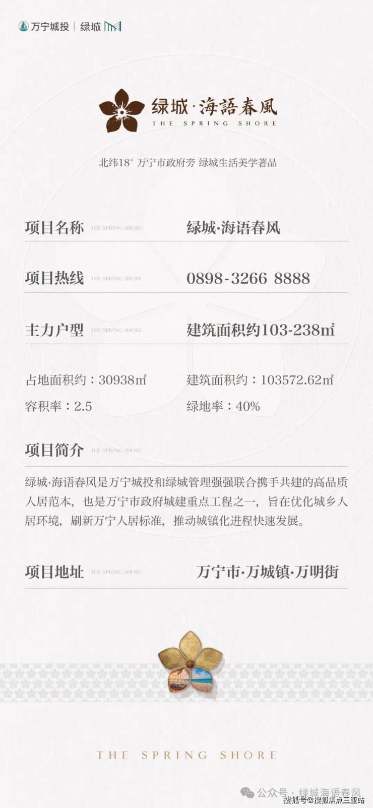 本宣传资料所有文字、数据、图片及所标注尺寸等仅为本项目建设区域设计效果的表达和示意,为要约邀请,不构成要约或承诺;相关内容不排除因政府相关规划、规定及其他原因而发生变化,一切有关房屋的具体信息以书面合同及政府最终审批文件为准,本资料所发布的内容为【2025】年【3】月信息。本公司保留对本资料修改的权利且不再另行通知,敬请留意最新资料。本项目推广案名为【绿城·海语春风】,开发商为【万晖置业】,管理商为【绿城管理】,本项目销售服务热线:0898-32668888