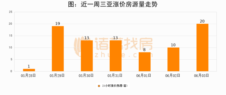 根据诸葛找房数据显示,三亚24小时涨价房源量为20套,较06月02日增加10套,环比上涨100%。与此同时,涨价房源占比小幅扩大,业主信心有所提升。