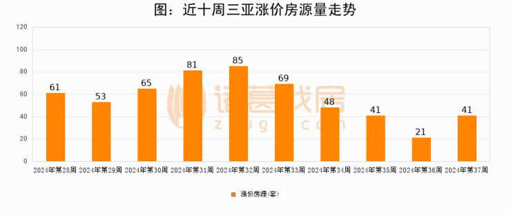 从调价房源来看,第37周三亚涨价房源41套,较上周上涨95.2%。与此同时,37周涨价房源占比回落24.17个百分点,业主信心小幅波动,购房者可则需入市。