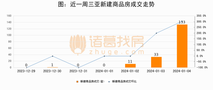 根据三亚市房产信息中心数据显示,2024年01月04日三亚新建商品房成交133套,较昨日增加100套,环比上涨303%
