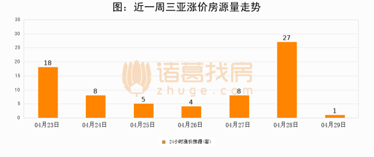 根据诸葛找房数据显示,三亚24小时涨价房源量为1套,较04月28日减少26套,环比下降96.3%。与此同时,涨价房源占比小幅回落,对于购房者来说是一个入市窗口期,购房者可抓住时机入市。