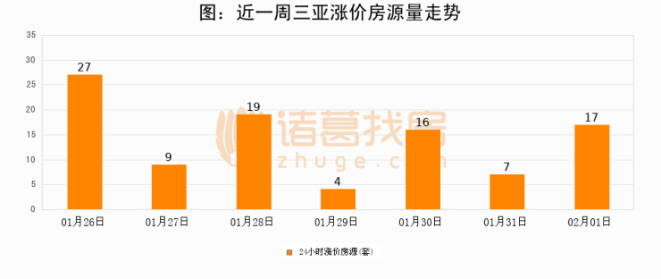 根据诸葛找房数据显示,三亚24小时涨价房源量为17套,较01月31日增加10套,环比上涨142.9%。与此同时,涨价房源占比小幅扩大,业主信心有所提升。