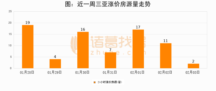 根据诸葛找房数据显示,三亚24小时涨价房源量为2套,较02月02日减少9套,环比下降81.8%。与此同时,涨价房源占比小幅回落,对于购房者来说是一个入市窗口期,购房者可抓住时机入市。