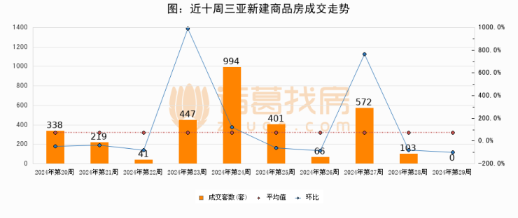 进入2024年第29周(07月15日-07月21日),三亚新建商品房成交0套,较上周减少103套,环比下降100%