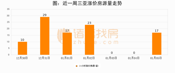 根据诸葛找房数据显示,三亚24小时涨价房源量为17套,较01月04日增加17套,环比上涨0%。与此同时,涨价房源占比小幅扩大,业主信心有所提升。